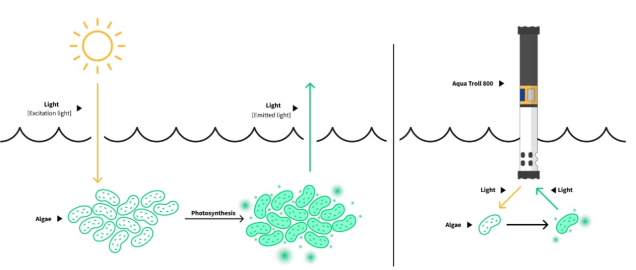 想象一下漂浮在湖中的藻类细胞。在典型的一天中,它根据其结构使用特定波长的光进行光合作用。原位荧光传感器根据要测量的内容,以几种自然产生的波长之一发光。我们都知道能量守恒定律:它既不能被创造也不能被破坏,只能从一种形式转移到另一种形式。在这种情况下,藻类细胞将光转化为细胞过程的能量,留下一点额外的能量。这种额外的能量以更高波长的光的形式发射回世界。荧光传感器中的光电探测器接收这种更高波长的光,相对荧光单位的计算在传感器内部进行。